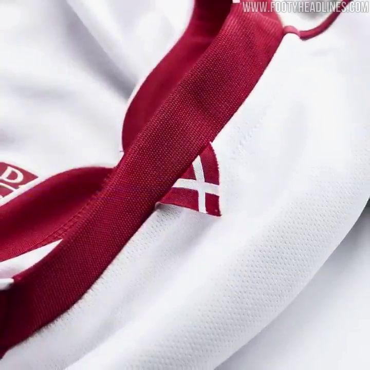 Das Auswärtstrikot ist weiß mit roten Details, was im Grunde genommen das Farbschema des ersten Dänemark-Trikots umkehrt. Das Design enthält ein dezentes V-förmiges Muster auf der Vorderseite.