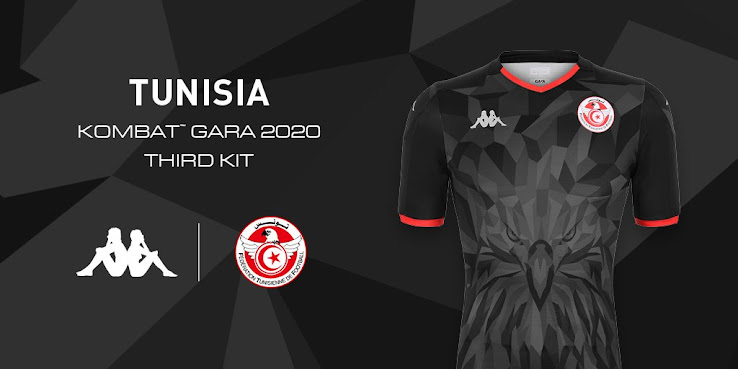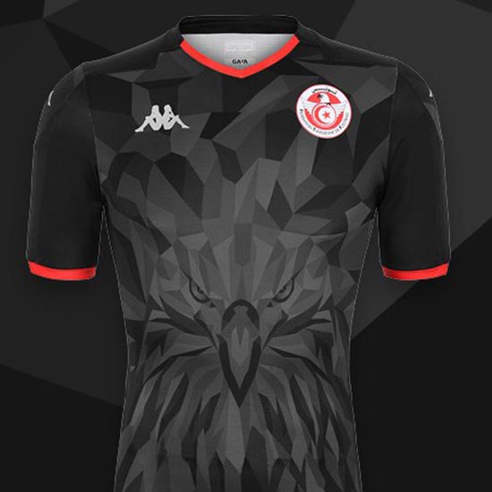 Das dritte neue Kappa Tunesien 2019-2020 Trikot ist schwarz mit einem umwerfenden Adler im Zentrum des Trikots. Es ist eine offensichtliche Anspielung auf die Adler von Karthago. Die Fußball-Auswahl trägt den Spitznamen seit vielen Jahren.