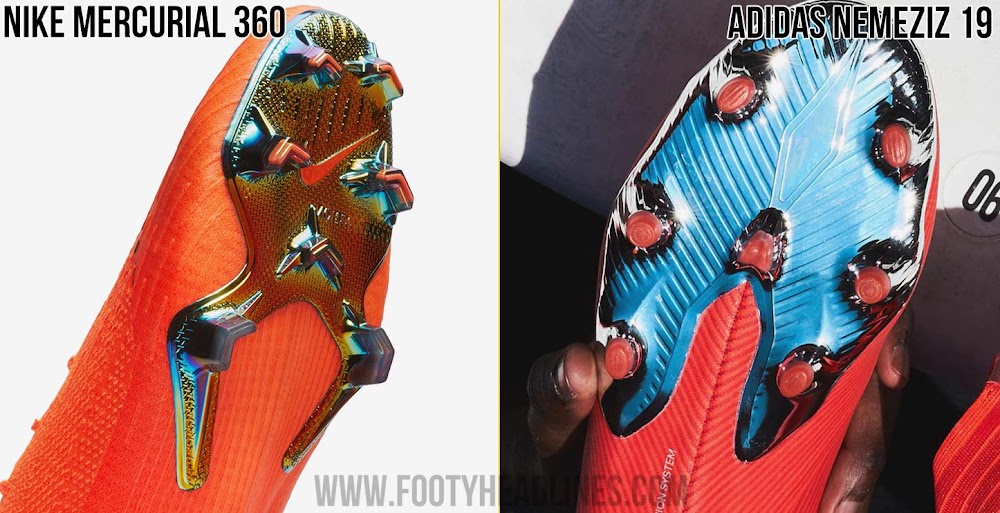 Das wichtigste Feature der Nike Mercurial 2018 Schuhe (Nike Mercurial Superfly VI & Nike Mercurial Vapor XIII) war die brandneue 360-Konstruktion. Der Mercurial Superfly 360 und der Mercurial Vapor 360 umhüllen den gesamten Fuß in Nike Flyknit. Das wichtigste Features des Adidas Nemeziz 19+ ist, dass der Schuh "revolutioniertes 360-Grad-Beweglichkeit und Leistung für kreative Spieler auf dem Platz bietet."