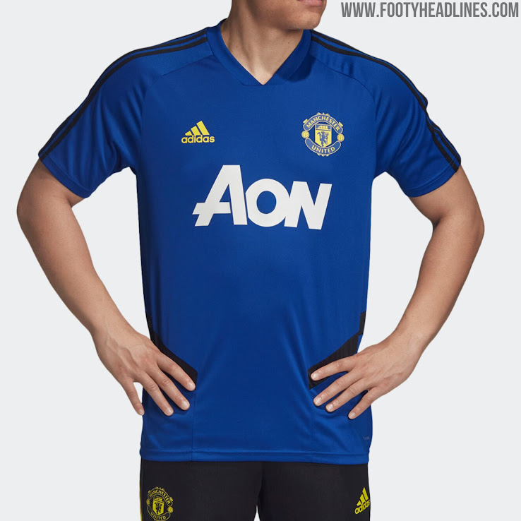 Auf Grundlage des neuen Adidas Tiro 19 Templates besteht das Manchester-United-Trainingstrikot aus einem blauen Trikot und schwarzer Hose (lang / kurz).