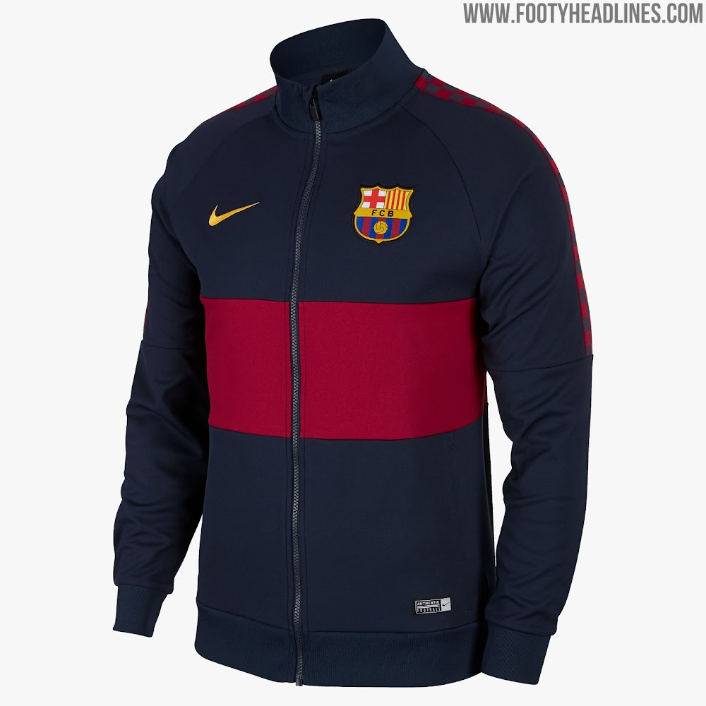 Auf Grundlage des neuen Nike I96 Templates ist die Barcelona 2019-2020 Trainingsjacke dunkelblau mit einem einzigen großen dunkelroten Querstreifen und einem goldenen Swoosh auf der rechten Brust darüber. Das vollfarbige Vereinswappen befindet sich auf der gegenüberliegenden Seite.