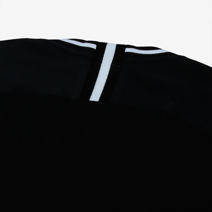 Das neue Corinthians 2019-20 Trikot ist überwiegend schwarz mit einem weiß / schwarzen Rundkragen. Es gibt einen speziellen Einsatz mit schwarzen und weißen Streifen.