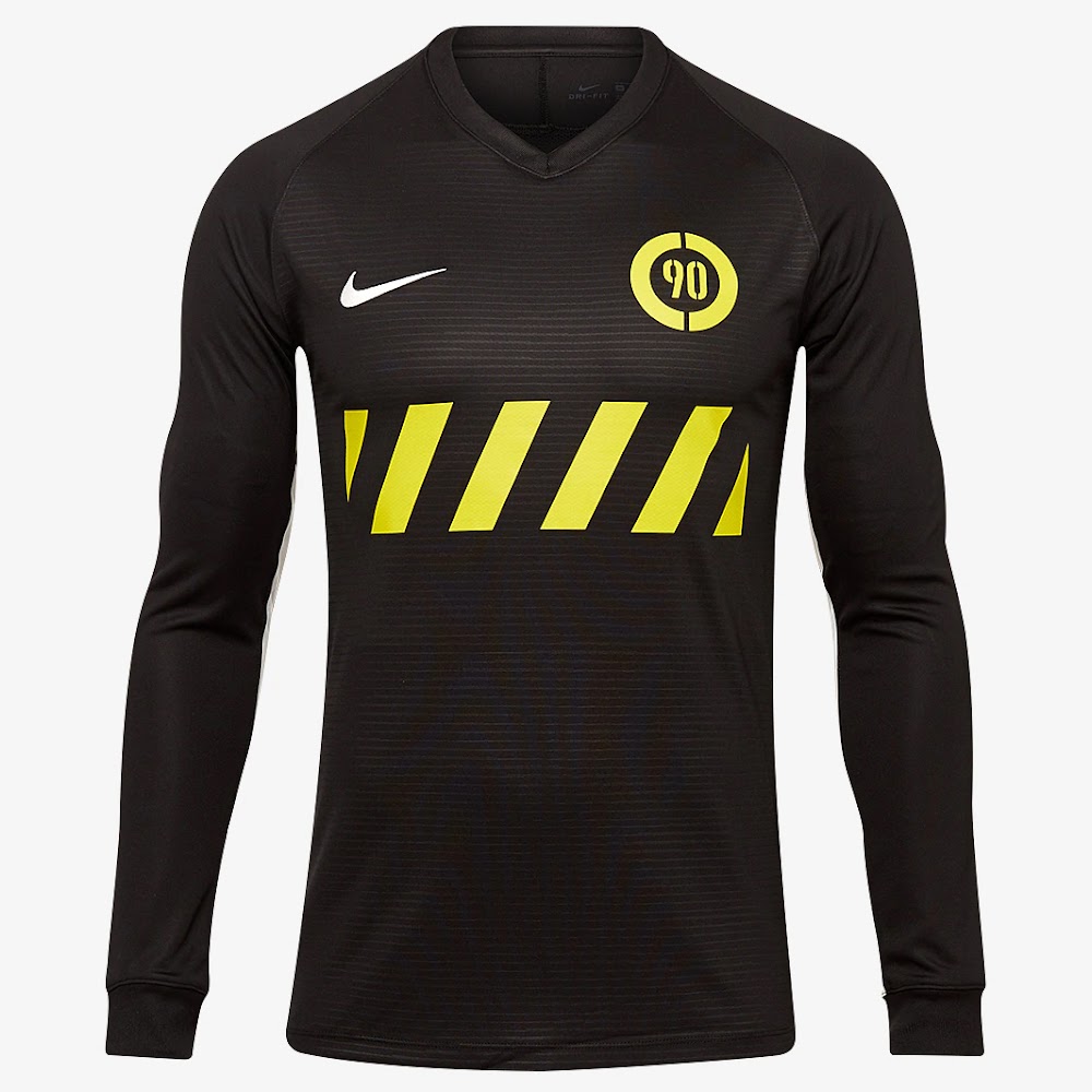 Das Nike T90 Laser Remix Limited Edition Trikot "ist eine Hommage an das Meisterwerk von 2007 mit einem T90-Logo und Gefahrenmuster auf der Brust in tödlichem Gelb und Schwarz".