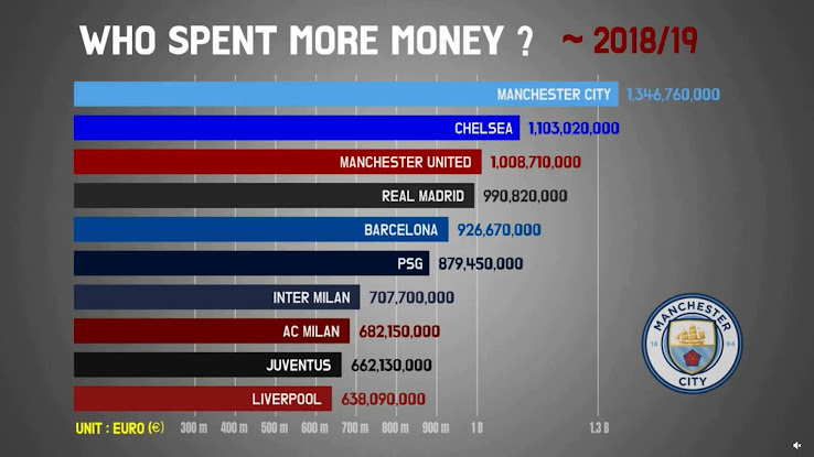 Das Video zeigt die Nettoausgaben der 10 größten Klubs in jeder Saison, ab 1991. Es zeigt deutlich die Entwicklung der Ausgaben im Fußball und auch, welche Mannschaften am meisten ausgegeben haben.