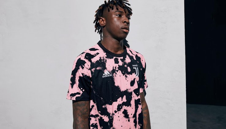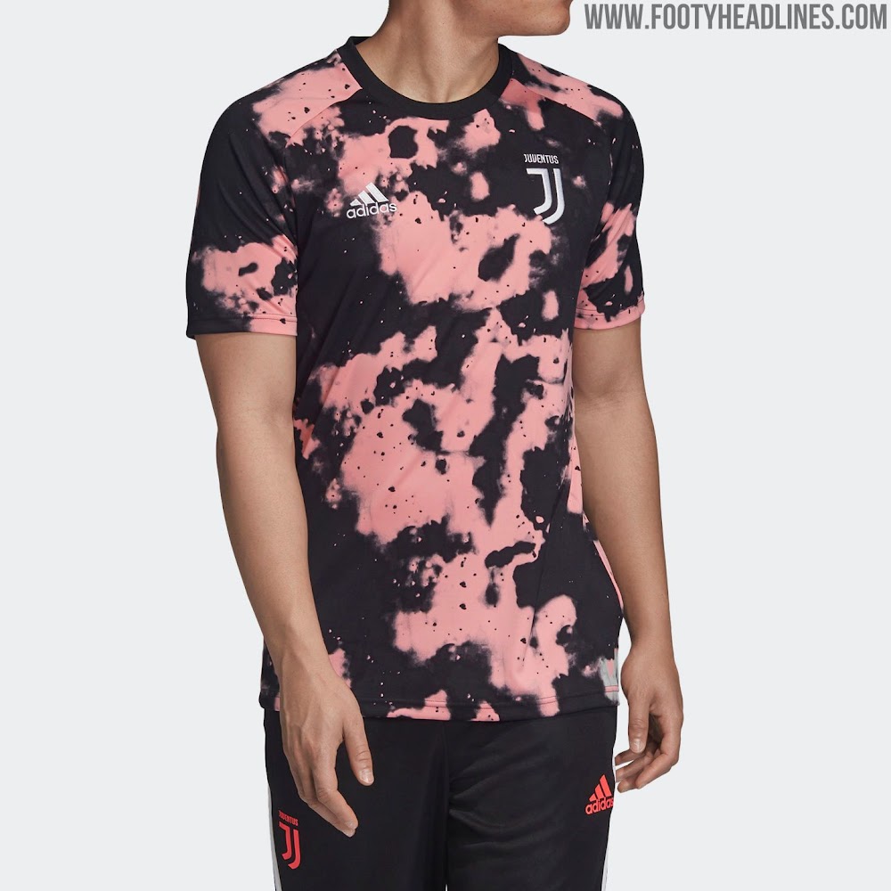 Auf Grundlage des neuen Adidas-Templates fürs Aufwärmen ist das Juventus-Trikot schwarz mit einer hellrosa "Bleach-Grafik", die das gesamte Design abdeckt.