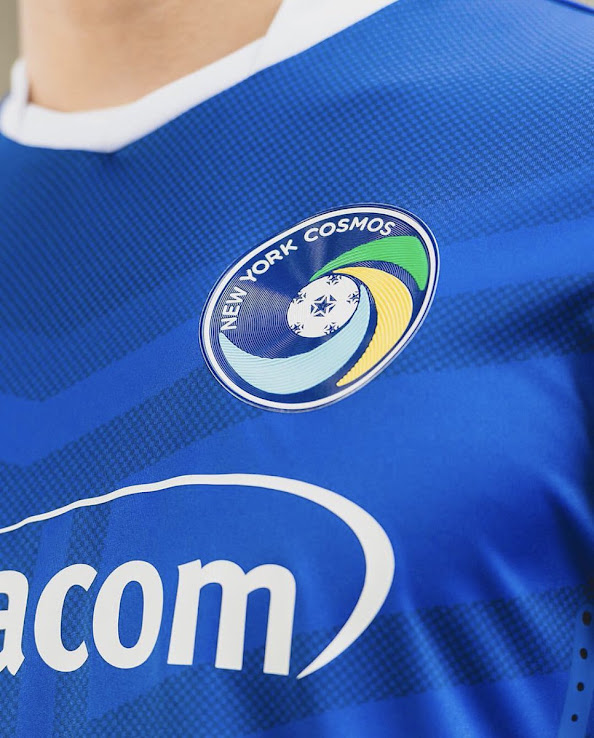 Das neue New York Cosmos 2019 Trikot wurde "inspiriert von der Architektur und Symmetrie der Gebäude und Brücken, die die Stadt prägen". Es ist blau mit einem karierten Muster, das innerhalb des Musters maskiert ist.