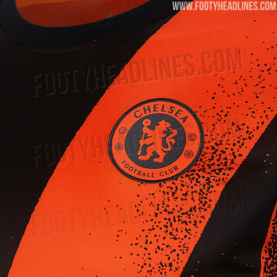 Überwiegend schwarz, weist das Trikot einen orangefarbenen, geometrischen, verblassenden Druck auf der Vorderseite und den Ärmeln sowie das klassische Nike-Logo der 90er Jahre auf der rechten Brust auf. Das Chelsea-Wappen auf der linken Brust wurde neu gefärbt, um dem allgemeinen Farbbild des Designs zu entsprechen.