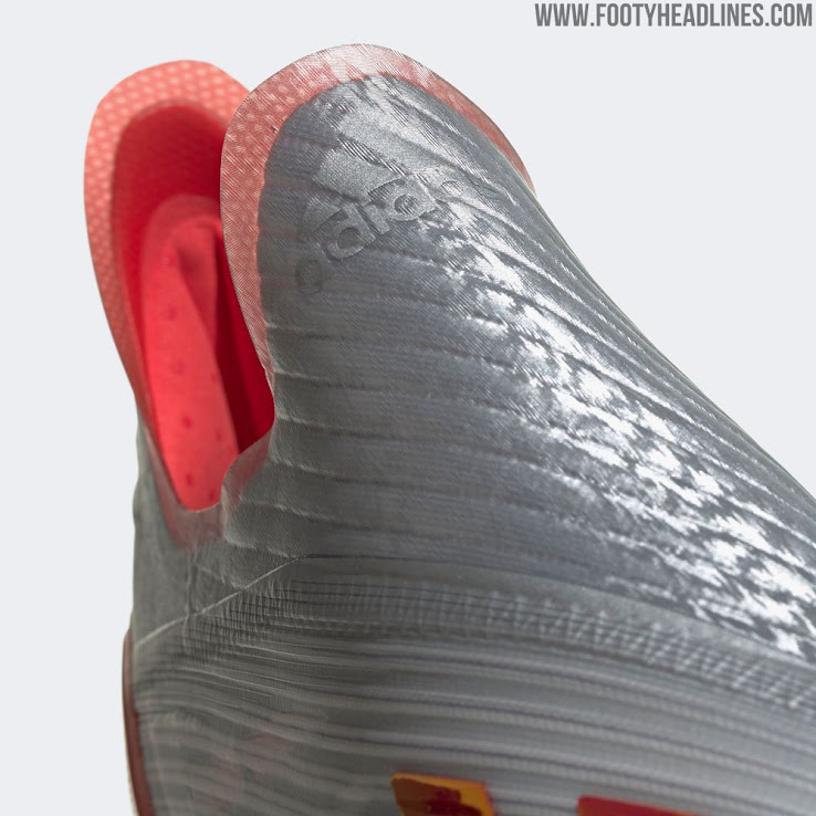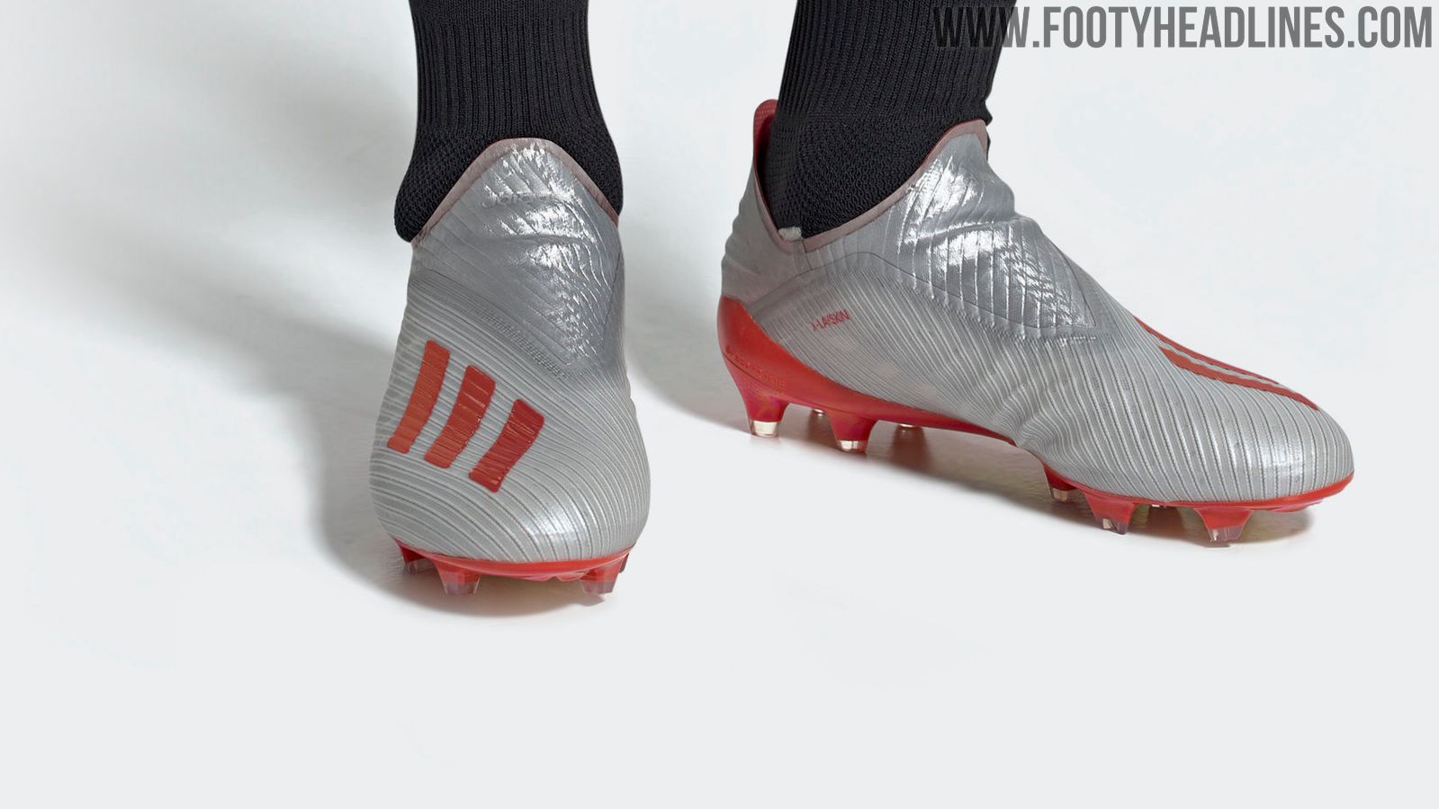 Die brandneuen Next-Gen Adidas X 19+ Fußballschuhe haben ein silbernes Obermaterial mit rot schillernden 3 Streifen auf dem Vorderfuß und eine Außensohle im gleichen Stil. Es ist ein spektakuläres Design, besonders im Vergleich zu den billigeren Versionen, die nur normale rote Details aufweisen.