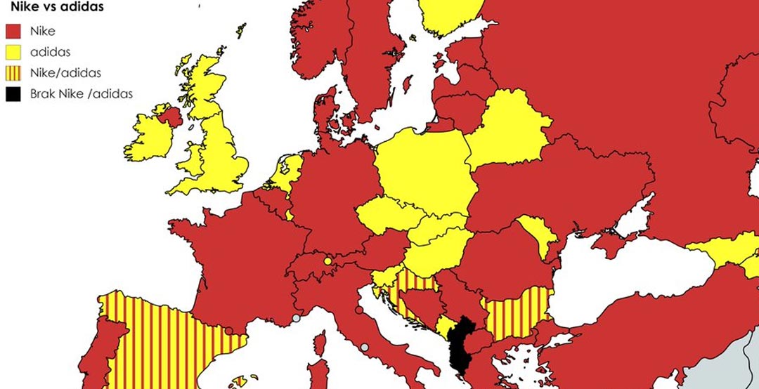 Der polnische "Futboholik" Michał Mączka (@futboholik1947) hat eine Infografik erschaffen, die zeigt, in welchen europäischen Ländern Adidas oder Nike die Trikots für die meisten Teams liefern.