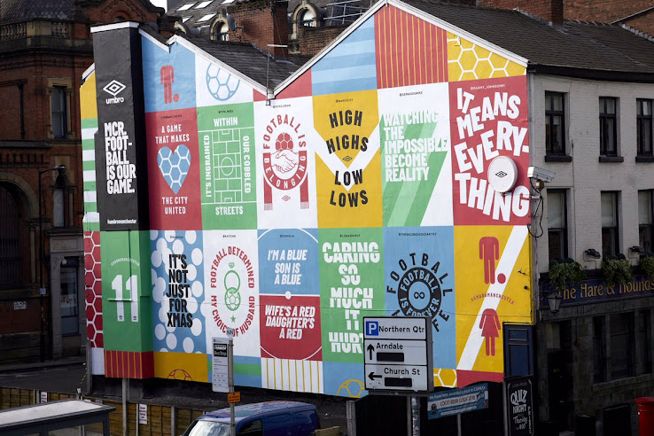 Aus diesem Anlass kreierten Umbro und der lokale Zeichner Tom Nicklin auch ein riesiges Wandbild, um die Liebe Manchesters zum Fußball zu feiern.