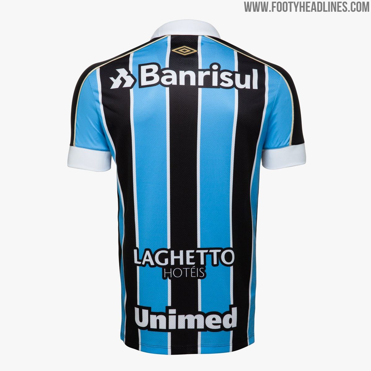 Das von Umbro hergestellte Gremio 2019-20 Trikot zeichnet sich durch das typische Design aus blauen, weißen und schwarzen Streifen aus und kombiniert es mit einem traditionellen, ganz weißen Kragen.