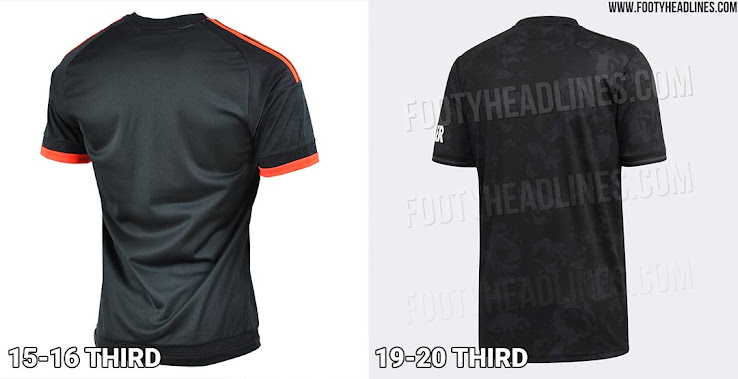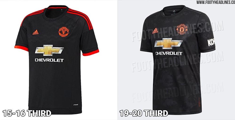 Die beiden Manchester United 2015-2016 und 2019-2020 Trikots sind überwiegend schwarz mit hellen Logos. Die Hauptunterschiede bestehen darin, dass das ManU 19-20 Trikot einen rötlicheren und weniger orangefarbenen Farbton verwendet und mit insgesamt weniger farbigen Elementen auskommt - die einfarbige Version des ManU-Wappens ist umgekehrt, während die Drei Streifen und die Ärmelbündchen anthrazitfarben sind.