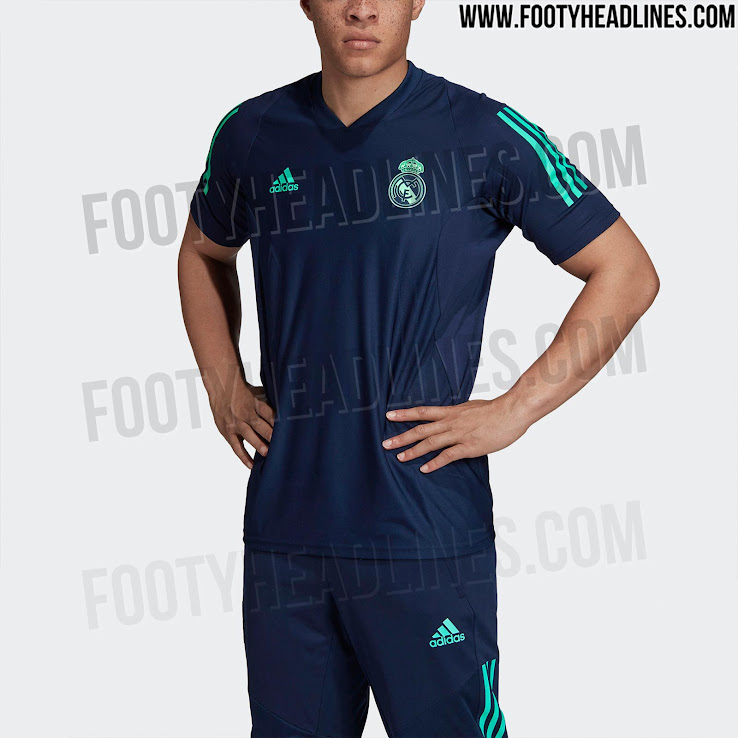 Das Adidas Real Madrid Trainingstrikot, das vom Ausweichtrikot des Klubs (UEFA Champions League Auswärts) inspiriert wurde, ist dunkelblau und türkisfarben. Tatsächlich sind es die umgekehrten Farben des Real Madrid 2019-20 Trikots, nur ohne Weiß.