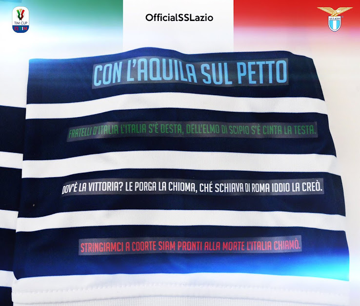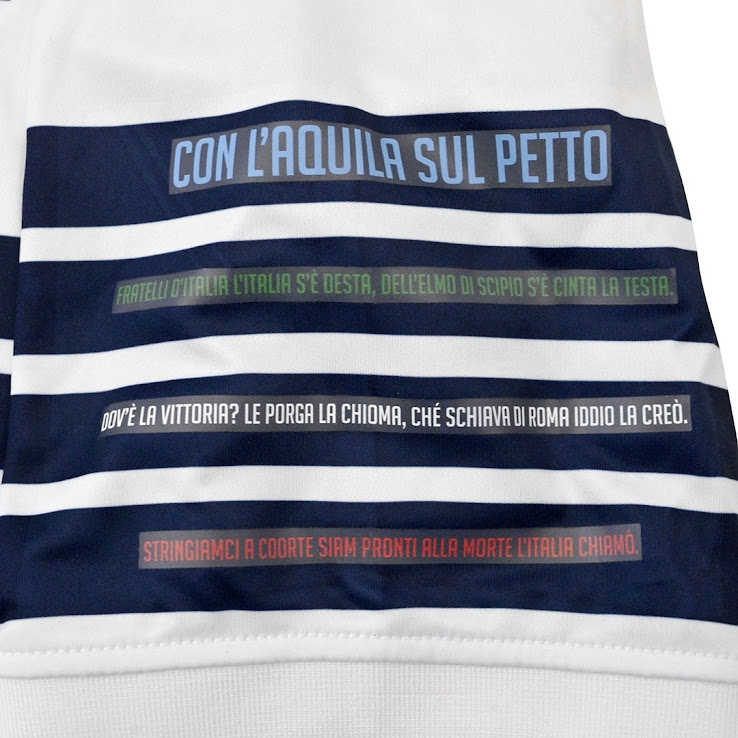 Auf dem linken Ärmel, passend zu den Flügeln des stilisierten Adlers, befindet sich die Inschrift "Con l'Aquila sul Petto" (Mit dem Adler auf der Brust) und dann eine weitere Hommage an die Hymne Italiens, die vor dem Spiel gespielt wird. Rechts der Patch des Finales und auf der Brust sind die Worte "Finale Tim Cup 2018-19 - Stadio Olimpico".
