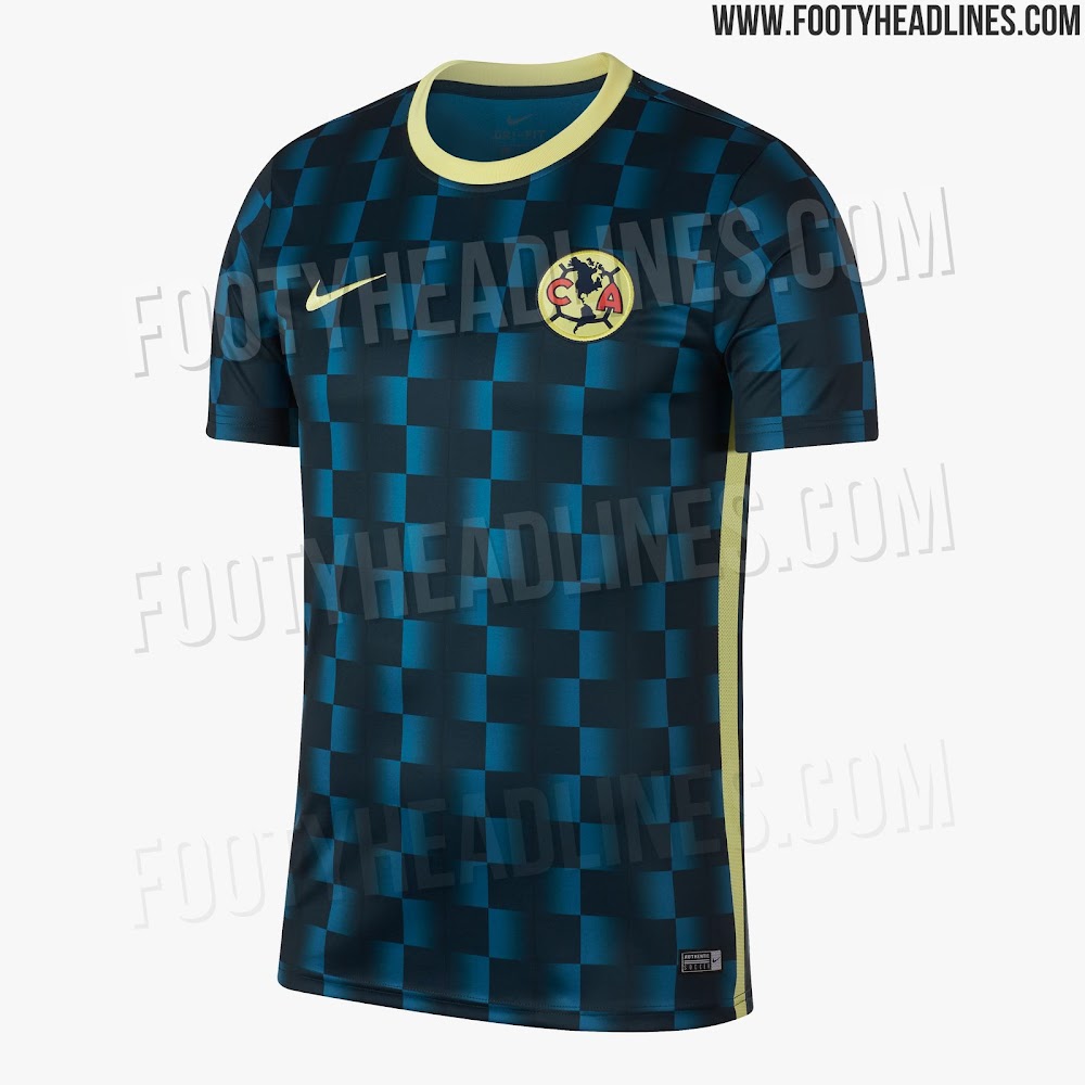 Während die Aufwärmtrikots von Nikes Elite-Teams einzigartige Designs aufweisen, basiert das von Club América auf dem Standardtemplate. Es kombiniert zwei Blautöne in Form einer verblassenden Karografik mit hellem Gelb für den Kragen und einem Streifen auf jeder Seite.