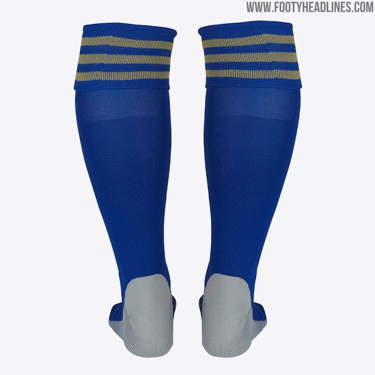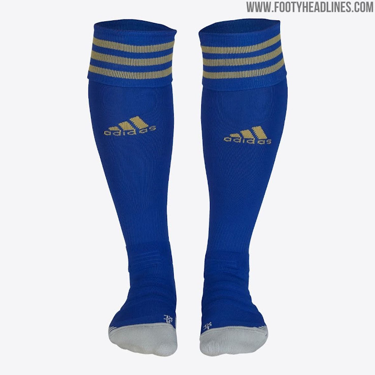 Weiße Hosen und blaue Stutzen, beide mit goldenen Adidas-Streifen, vervollständigen das Leicester City 2019-2020 Adidas Trikot.