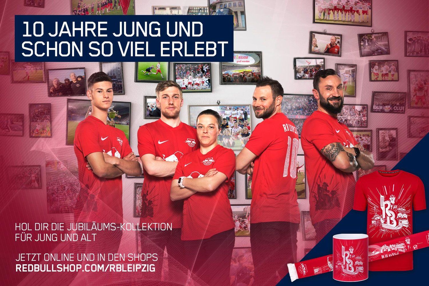 Der Bundesligist RB Leipzig hat heute Morgen eine Sonderkollektion zum 10-jährigen Bestehen des Klubs nach der Übernahme durch den Energy-Drink-Giganten Red Bull vorgestellt. Zur Kollektion gehören ein limitiertes Trikot sowie ein T-Shirt, ein Schal und eine Tasse im gleichen Stil.