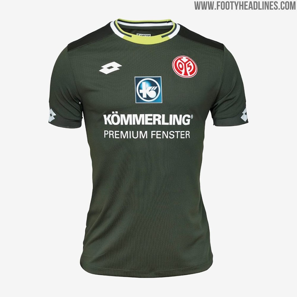 Das neue Mainz 19-20 Trikot liefert eine ungewöhnliche Farbkombination für den Klub und ist dunkelgrün / militärgrün mit hellgrünen und weißen Details.