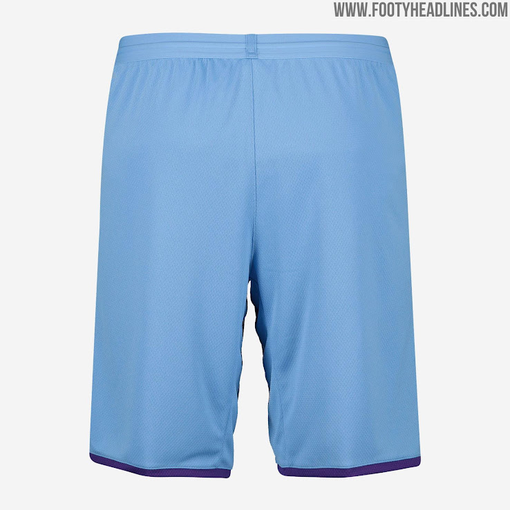 Das Manchester City 2019-20 Trikot ist himmelblau mit violetten Logos auf der Vorderseite und einem lila Streifen, der auf den Ärmeln verläuft.