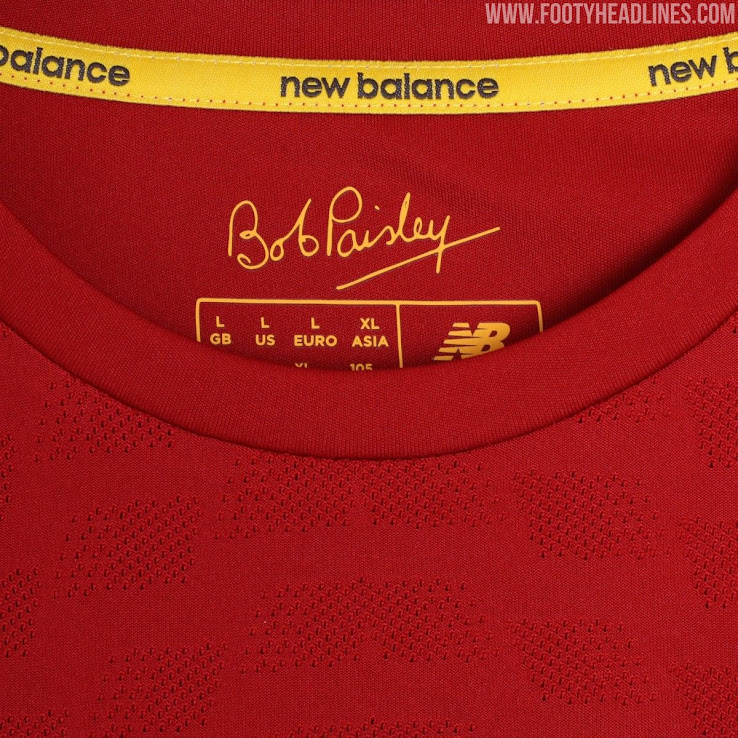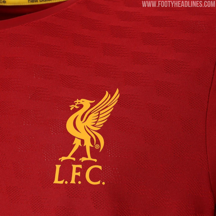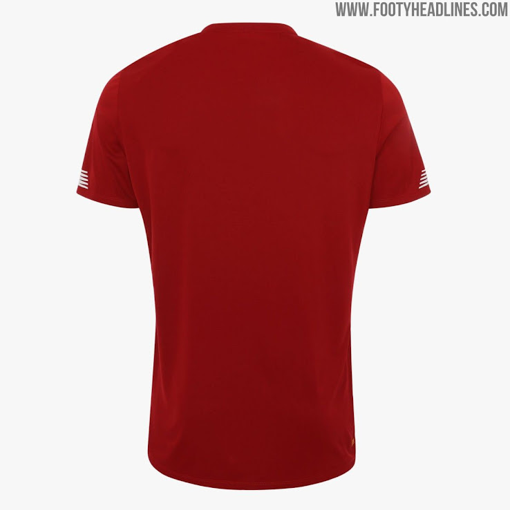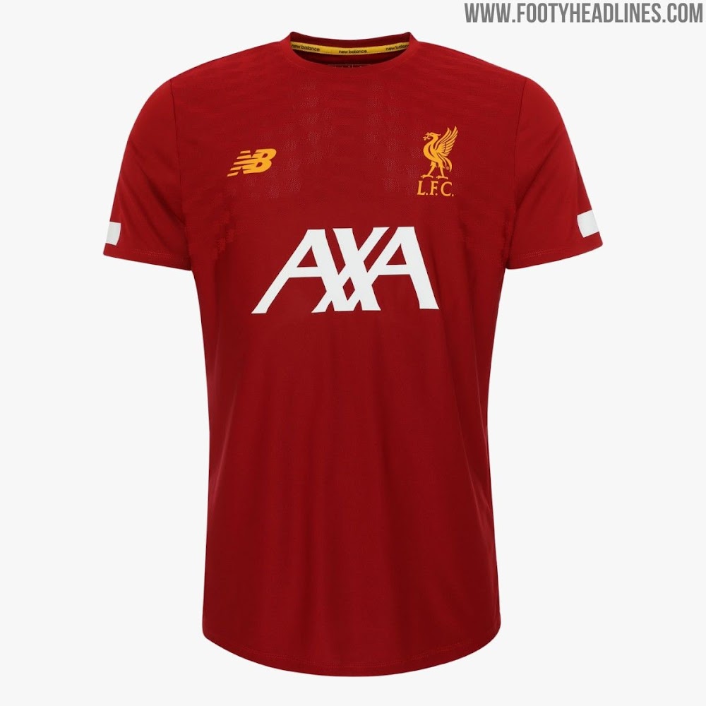 Das Liverpool 2019-20 Aufwärm-Trikot, das ein ähnliches Design wie das Spieltrikot hat, ist dunkelrot mit goldenen NB- und Vereinslogos auf der Brust. Der Besatz an den Enden der Ärmel ist weiß, genau wie das große Axa-Sponsorenlogo auf der Vorderseite des Trikots.