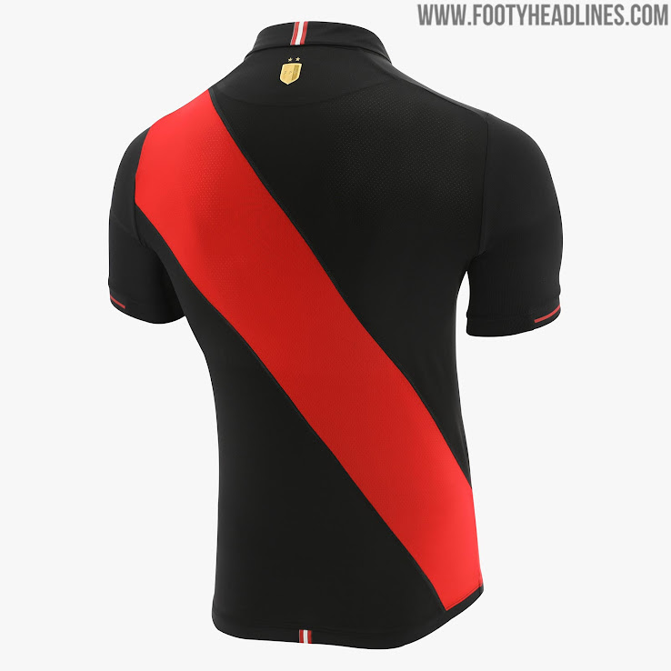 Auf Grundlage des gleichen Designs und Templates wie das Heimtrikot ist das zweite neue Peru 2019 Trikot schwarz mit einer roten Schärpe und goldenen Details. Auf der Nackenrückseite befindet sich die Landesflagge, während das Logo des peruanischen Verbands in Gold unterhalb des Kragens platziert ist.