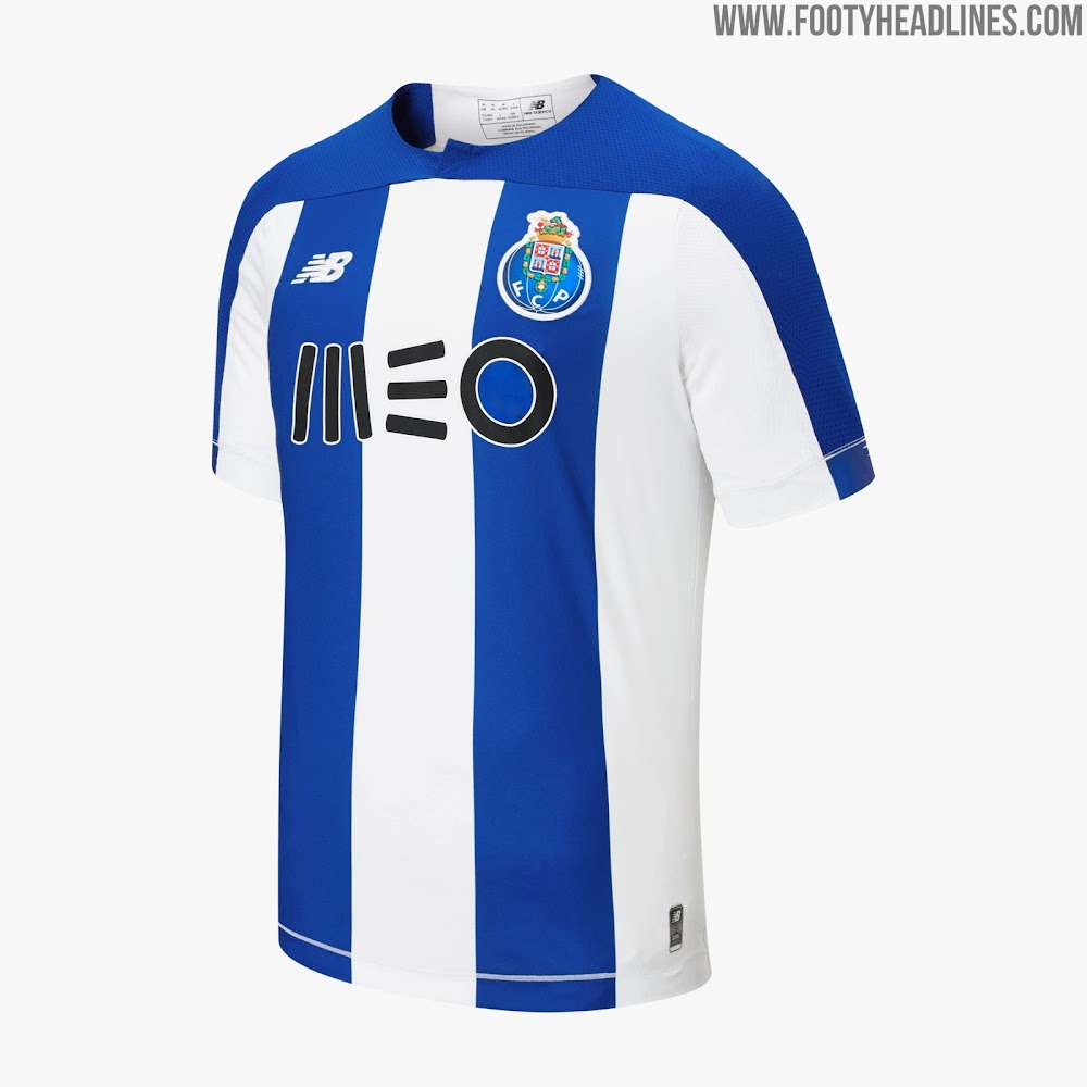 Das neue Porto 2019-20 Trikot ist weiß mit zwei blauen Streifen auf der Vorderseite und einem blauen Schulter- und Oberarmteil.