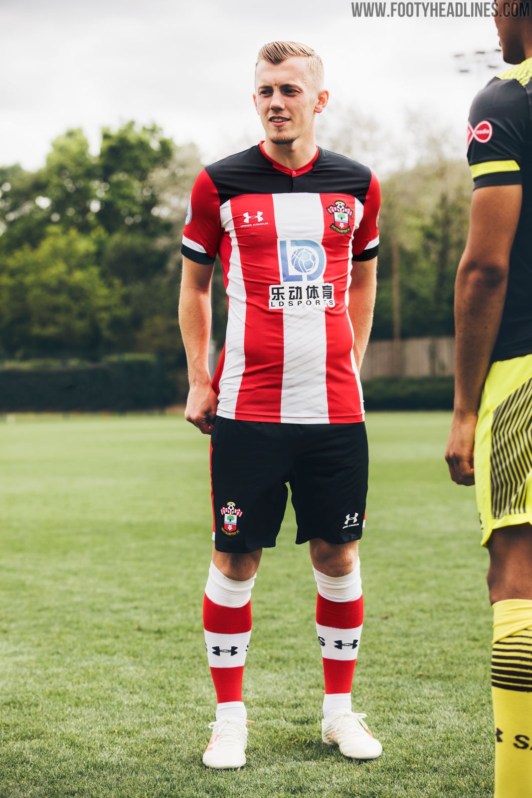 Schwarze Hosen mit roten und weißen Akzenten und geringelte Stutzen runden das neue Southampton-Heimtrikot ab.