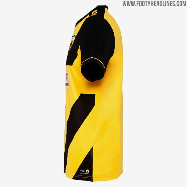 Das AEK Athen 2019-20 Trikot führt eine ungewöhnliche Optik mit schwarzen und gelben Diagonalstreifen auf der Vorderseite ein. Die Ärmel sind ganz schwarz, während der Großteil der Rückseite des neuen AEK Athen 2019-2020 Trikots gelb ist, um eine bessere Sichtbarkeit der Beflockung zu gewährleisten.