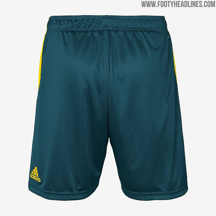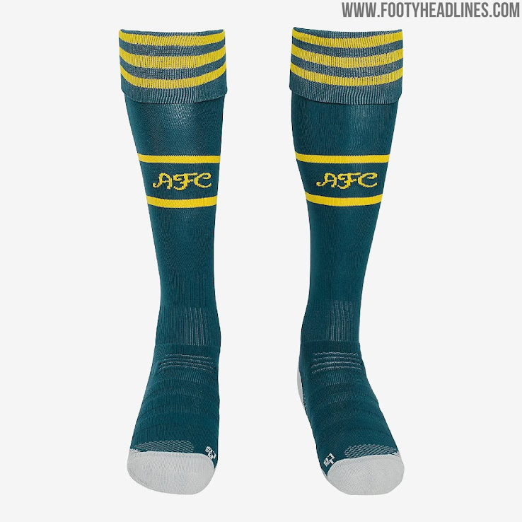 Adidas kombiniert das Arsenal 2019-20 Torwart-Trikot mit dunkelblauen Hosen und Stutzen.