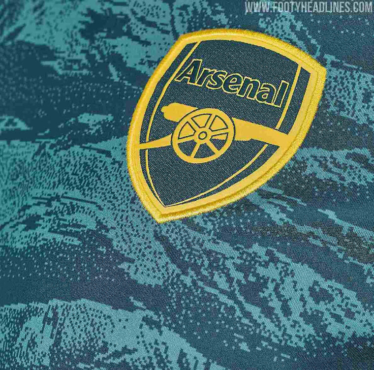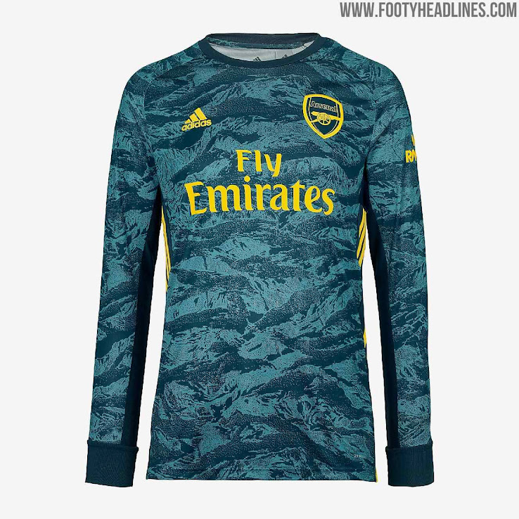 Auf Grundlage des AdiPro-19-Templates ist das Arsenal 2019-2020 Torwart-Trikot in einen grünlichen Blauton mit einem tonalen "Berg"-Druck auf der Vorderseite, Rückseite und den Ärmeln gehüllt.