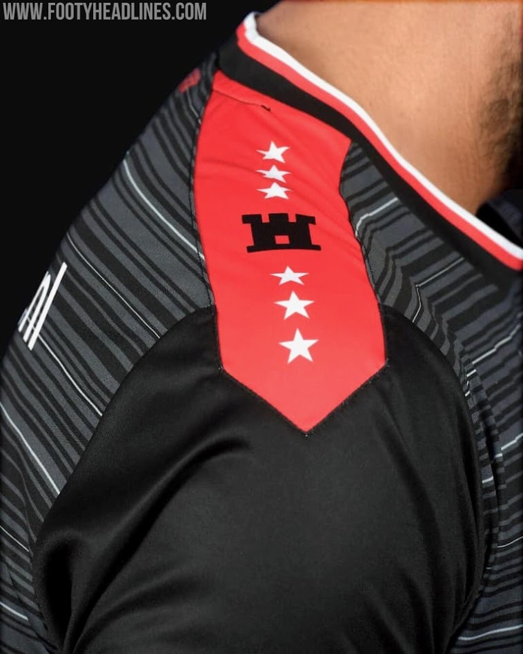 Das gleiche Schulterdetail ist auf dem neuen FC Emmen Auswärtstrikot vorhanden, das ansonsten schwarz mit einer interessanten horizontalen Streifengrafik in Grau und Weiß ist. Rote Details runden die elegante Optik ab.
