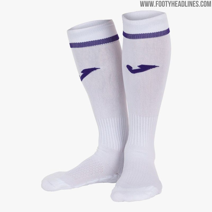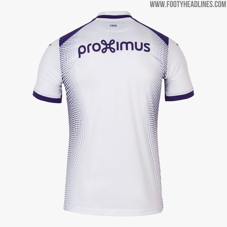 Das Auswärtstrikot ist hauptsächlich weiß mit lilafarbenen Akzenten an Schultern, Hals, Ärmeln und den Seiten. Zusätzlich gibt es einen Farbübergang zu den Seiten des neuen Anderlecht Joma Auswärtstrikots.