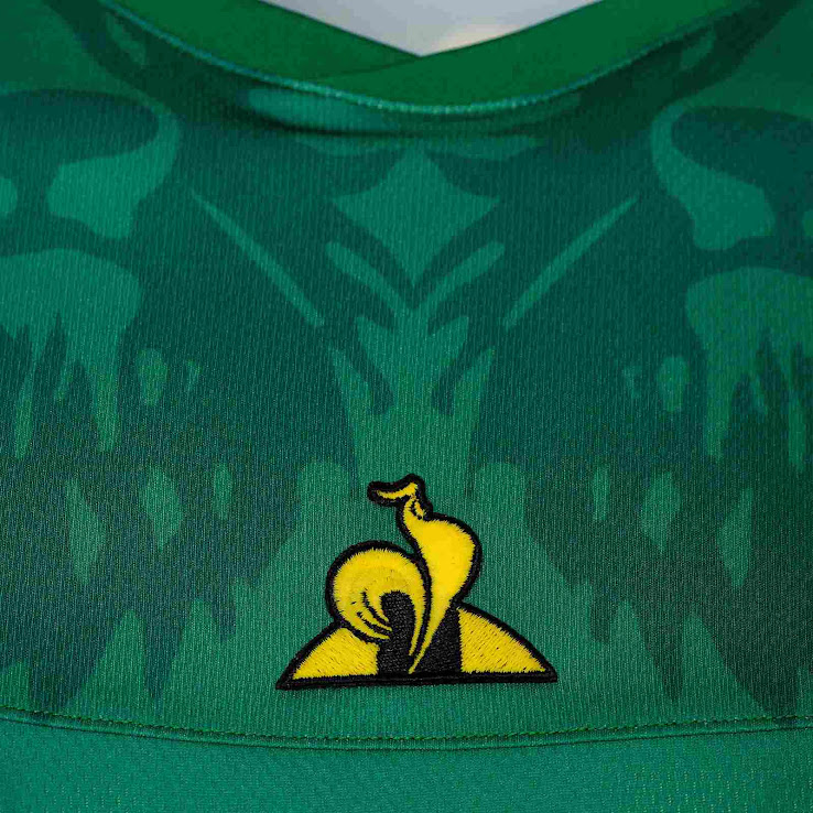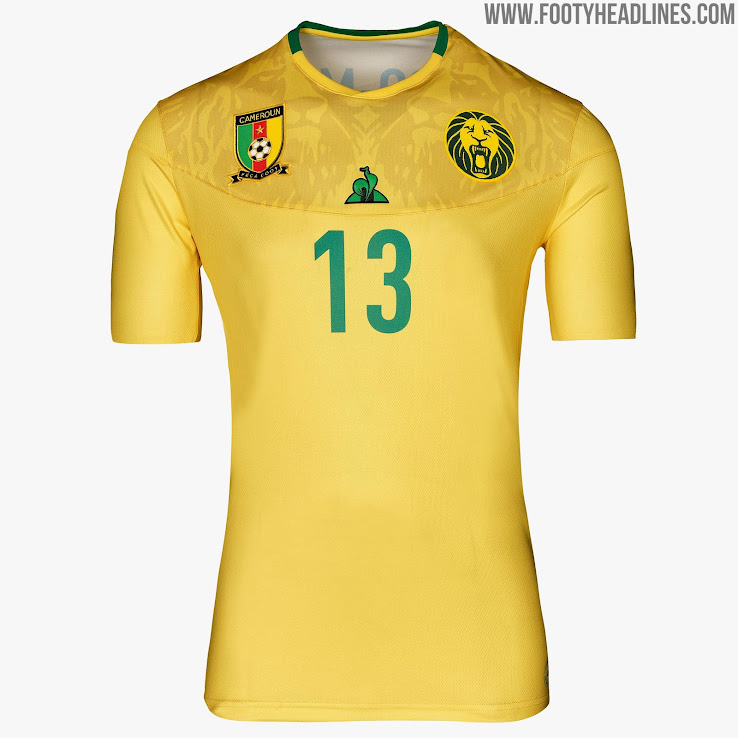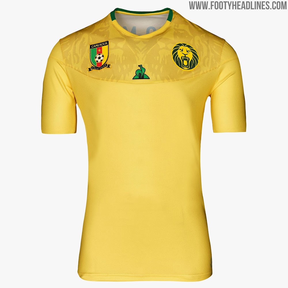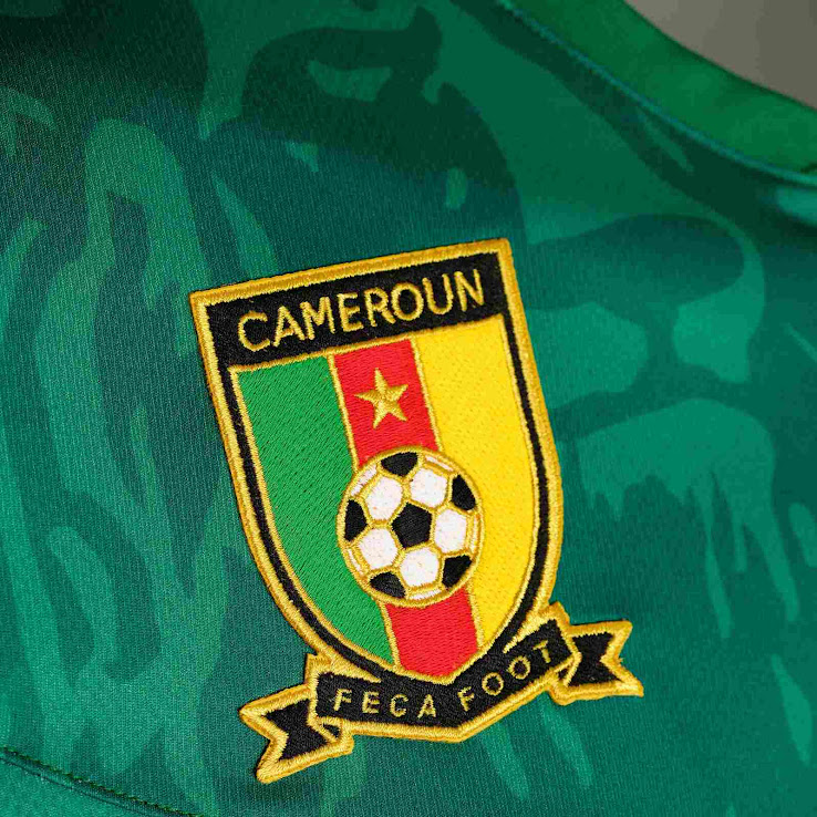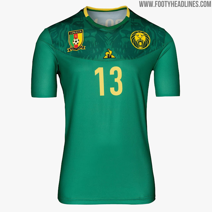 Das neue Kamerun-Heimtrikot ist grün mit einem Druck von zwei Löwenköpfen auf der Brust. Ein gelbes Le Coq Sportif Logo befindet sich in der Mitte der Brust, wobei die Teamlogos auf beiden Seiten etwas weiter oben platziert sind.