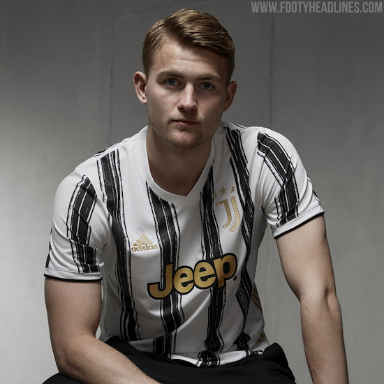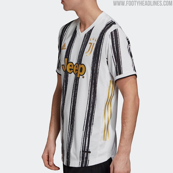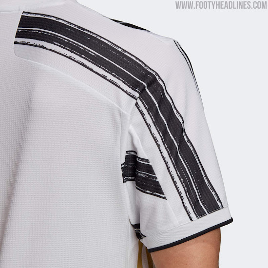 Das neue Juventus 2020-2021 Trikot, das überwiegend weiß ist, weist vier schwarze Pinselstrichstreifen auf der Vorderseite und den Ärmeln auf - die Rückseite ist komplett weiß.
