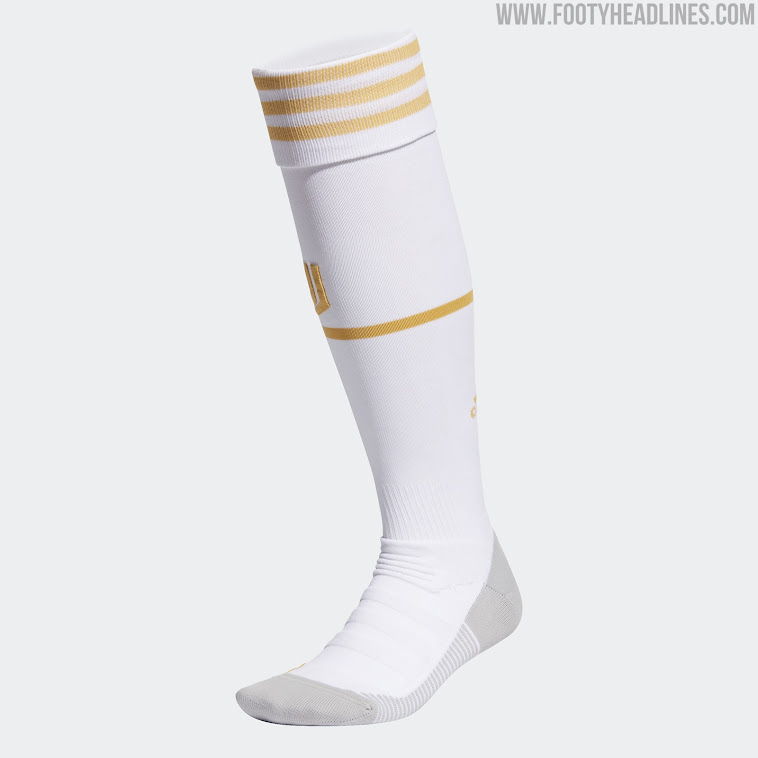 Adidas kombiniert das Juventus 2020-21 Fussballtrikot mit weißen Hosen und Stutzen, die beide goldene Logos und Streifen aufweisen.
