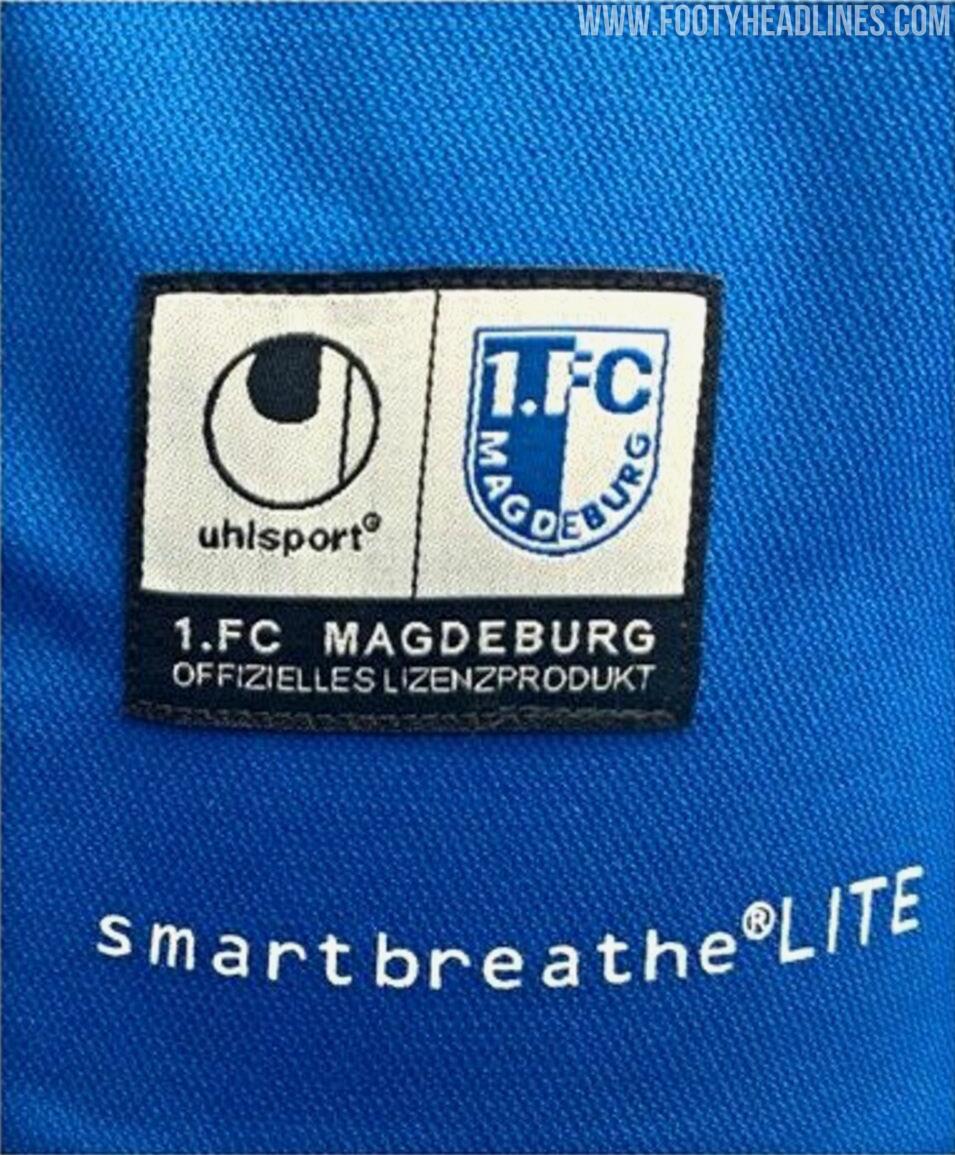 Magedburgs Trikot 19/20 liefert eine sehr klassische Optik und ist blau mit weißem Polokragen und weißen Ärmelbündchen.