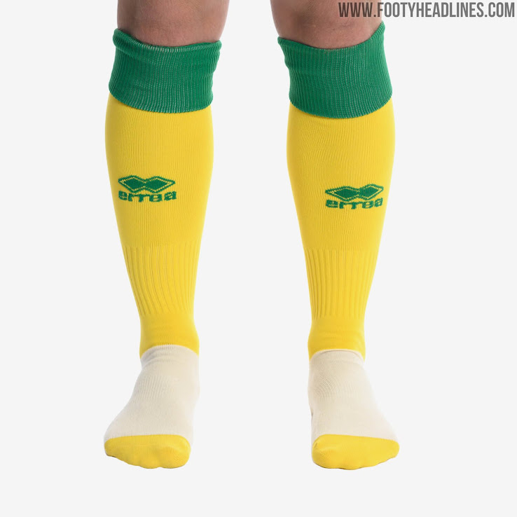 Grüne Hosen und gelbe Stutzen komplettieren das neue Norwich 2019-20 Errea Trikot.