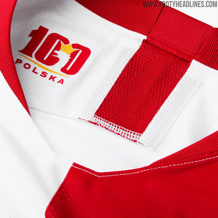 Auf der rechten Brust des Polen-Jubiläumstrikots sitzt ein roter Swoosh, auf der gegenüberliegenden Seite das Wappen der Nationalmannschaft. Ein besonderes Logo zum 100. Jahrestag der Verbandsgründung wird im Nackeninneren vorhanden sein.