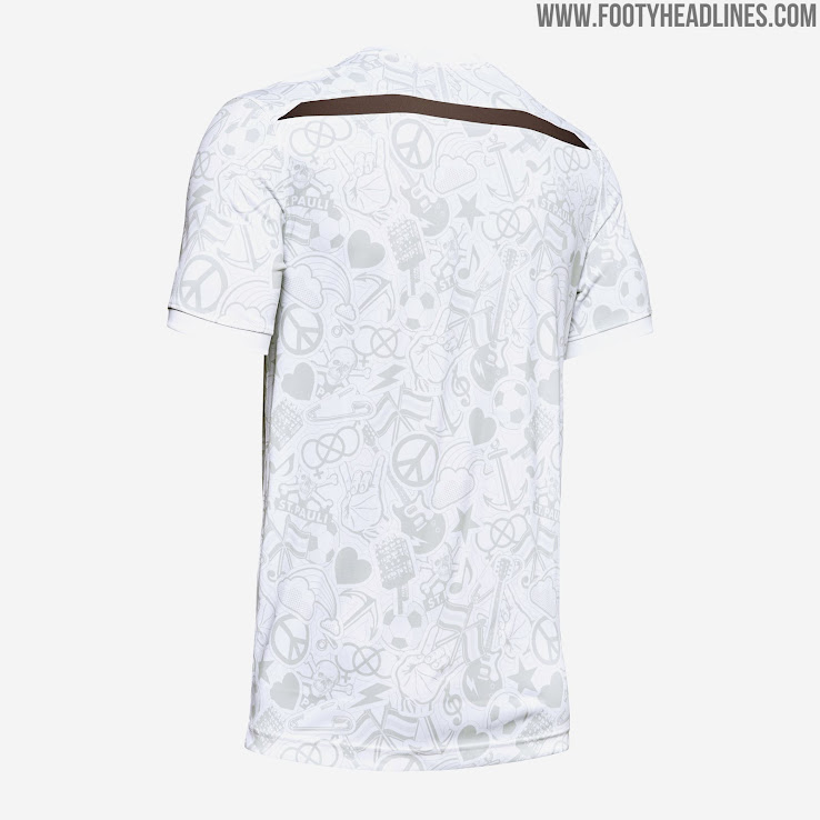 Das überwiegend weiße, neue St. Pauli 2019-2020 Trikot zeichnet sich durch einen auffälligen Allover-Grafikdruck und das Panel auf der Vorderseite in Braun aus.