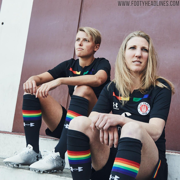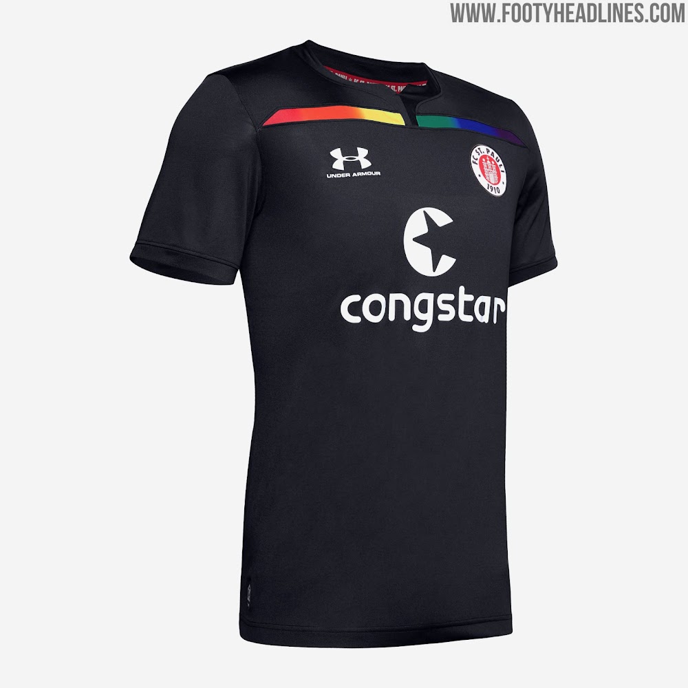 Das dritte St. Pauli 2019-2020 Trikot ist schwarz mit einem regenbogenfarbenen Panel auf der Vorderseite direkt unter dem Kragen. Die Logos sind weiß.