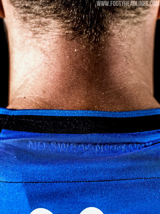 Der Kragen und die Ärmelbündchen sind dunkelblau, während auf dem oberen Teil und den Ärmeln des neuen Brügge-Auswärtstrikots ein verblassender Grafikdruck zu sehen ist. Die Logos sind weiß.