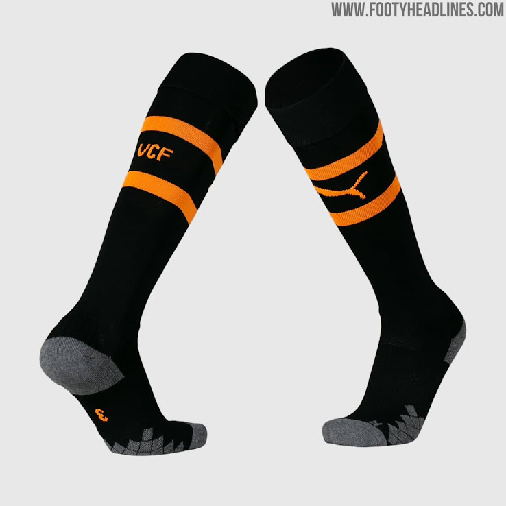Orange Hosen und schwarze Stutzen komplettieren die Optik des neuen Valencia 2019-20 Trikots von Puma.
