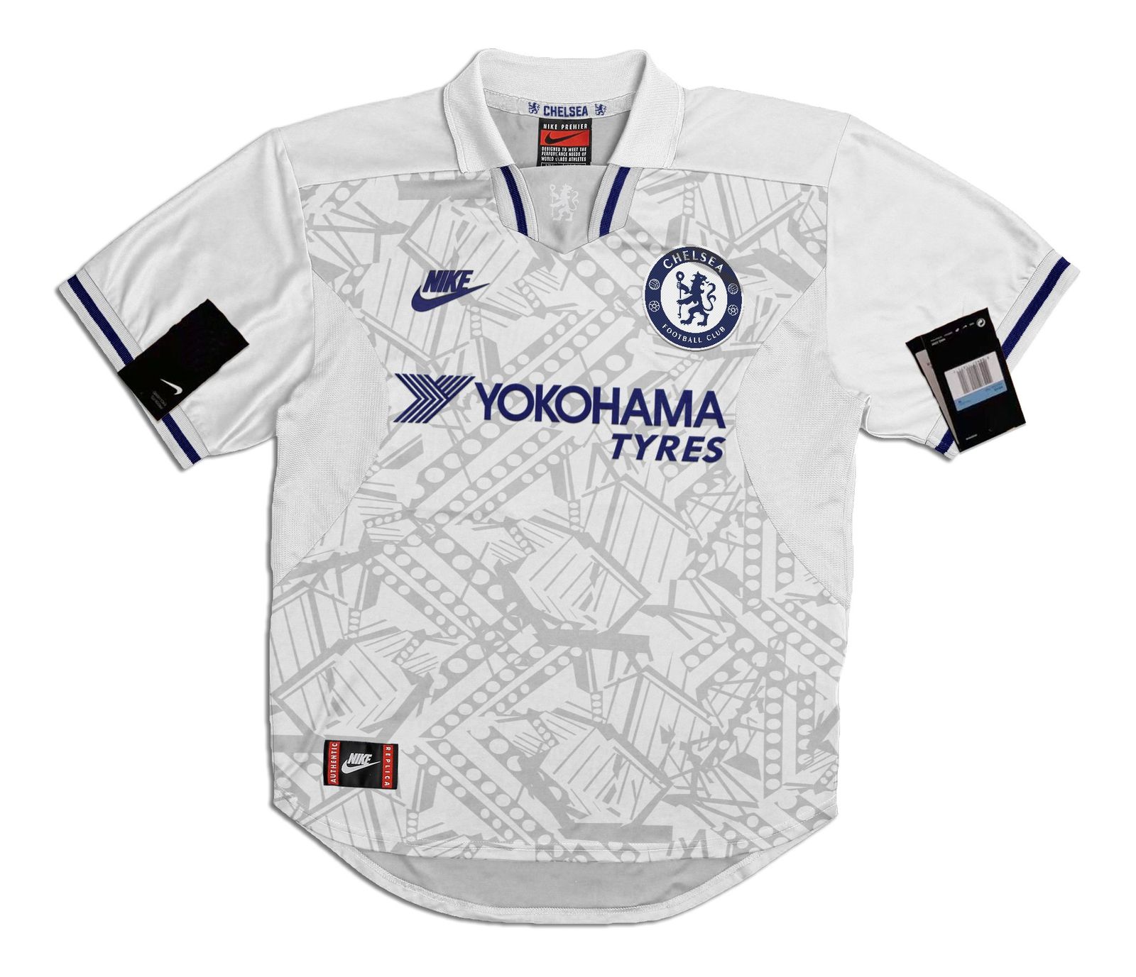 Auf Grundlage der Nike-Premier-Vorlage aus den 90er Jahren, die die richtigen Ausweichtrikots 19/20 der Marke inspirierte, ist eines der Konzepttrikots schwarz mit silbernen Details. Auf der Vorderseite befindet sich der gleiche, vom Stadion inspirierte Druck des Chelsea 2019-2020 Heimtrikots.
