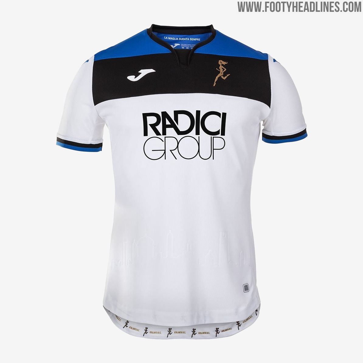 Überwiegend weiß, befindet sich an der Spitze von Atalantas neuem Auswärtstrikot ein blau / schwarzer Querstreifen, ein Detail, das sich in den zweifarbigen Manschetten widerspiegelt.