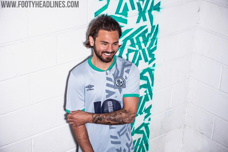 Umbro kombiniert das Blackburn 2019-2020 Trikot mit grauen Hosen und grünen Stutzen.