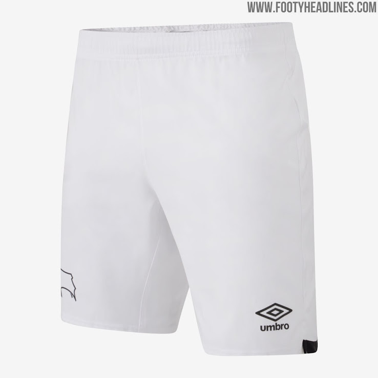 Die Hose des neuen Derby County 19-20 Trikots ist weiß, während die Stutzen schwarz sind.