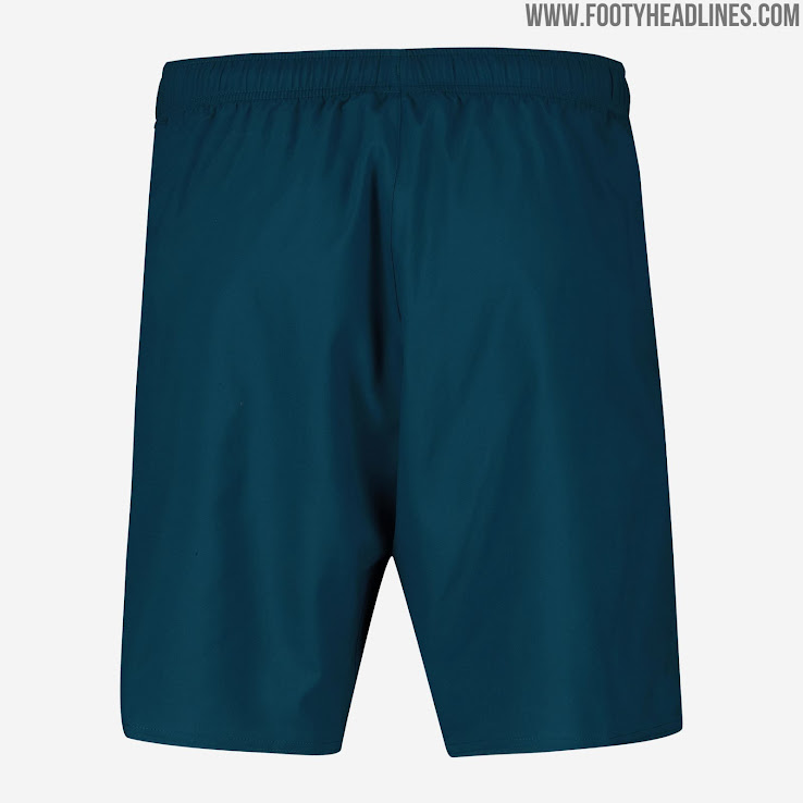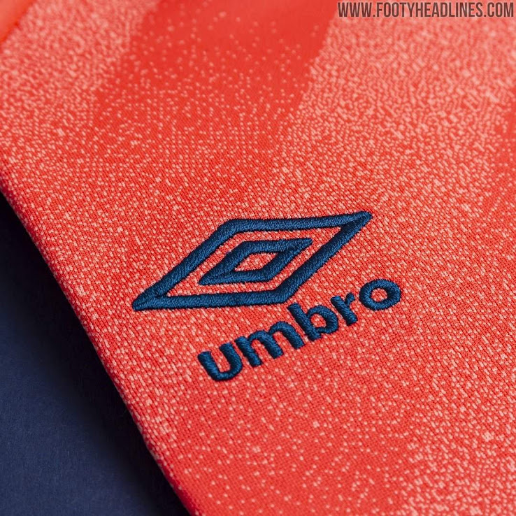 Marineblaue Hosen und lachsfarbene Stutzen vervollständigen das neue Umbro Everton 2019-20 Trikot.