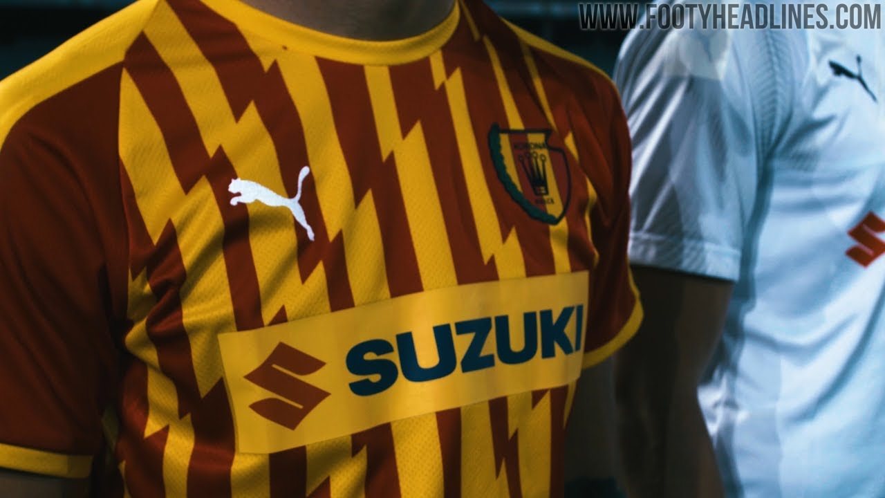 Das neue Korona Kielce 2019-2020 Trikot, das auf dem selben Template wie Viktoria Pilsen basiert, führt eine spektakuläre Optik in Rot und Gelb mit einem blitzartigen Streifenmuster ein.