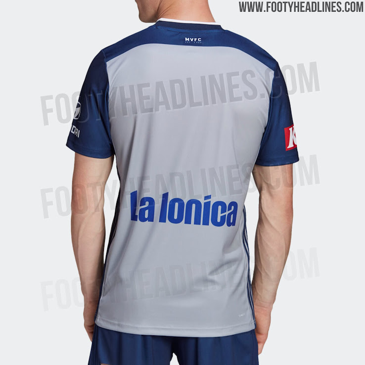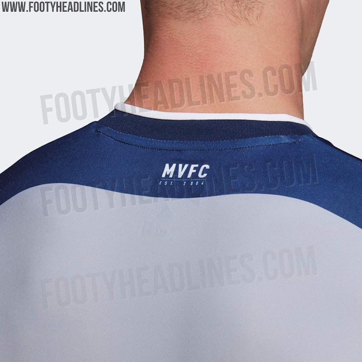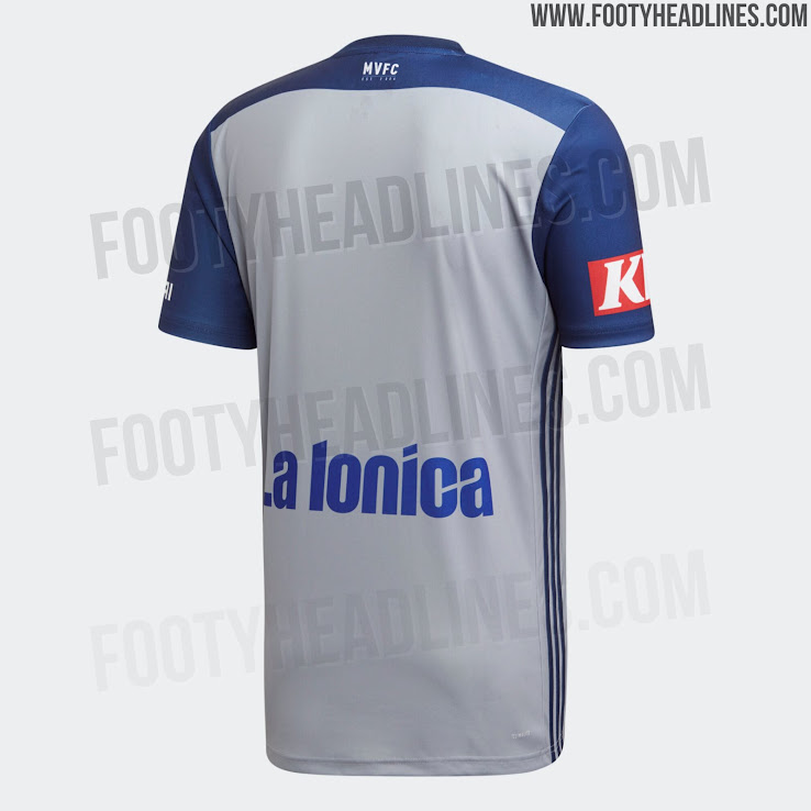 Das Akronym und das Gründungsjahr des Vereins - "MVFC - Est. 2004" - sind auf die obere Rückseite des Melbourne Victory 19-20 Trikots gedruckt, direkt unter den Kragen. Die gesamte Rückseite des Trikots ist grau, wobei dunkelblaue Adidas-Streifen auf beiden Seiten des Trikots verlaufen.