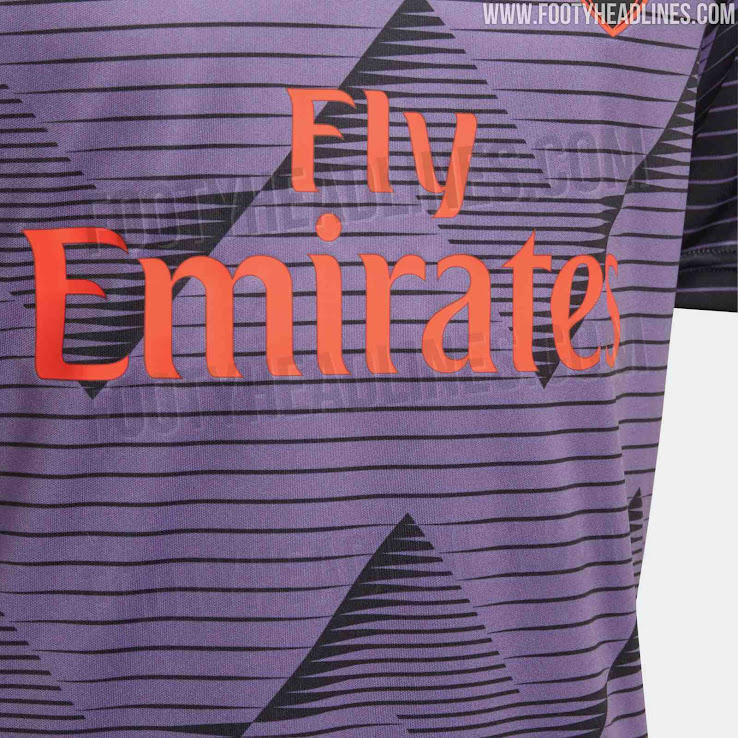 Die Logos von Adidas und Fly Emirates sind auffällig rot, während das Arsenal-Wappen zweifarbig rot / schwarz ist. Auf der meist dunkelviolette Rückseite befindet sich der Arsenal-Schriftzug vertikal.